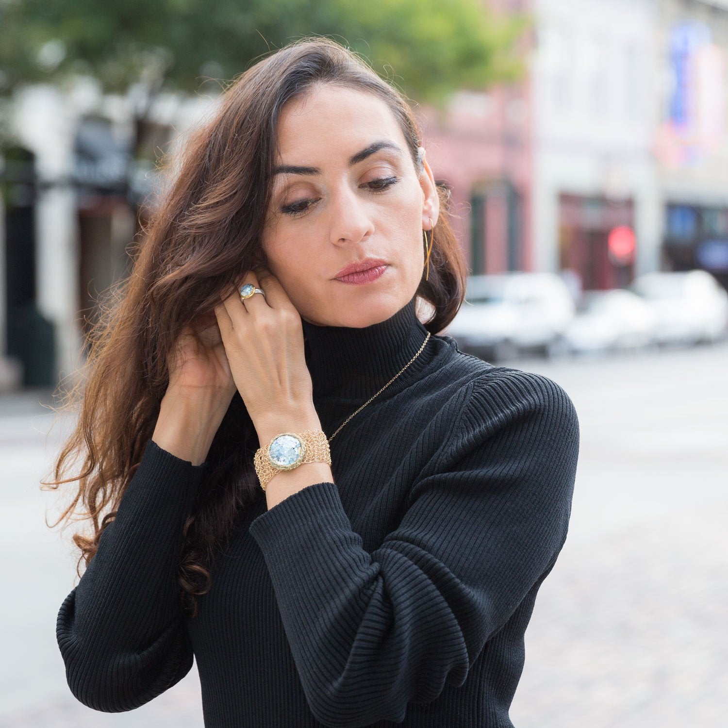 7.25" 14/20 gold filled hand woven band with 32mm center Ancient Roman Glass. The bracelet has a slide tube magnetic clasp.Ancient Roman glass coloring will vary. Comes with Certificate of Authenticity.
