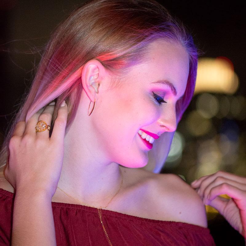 Contemporary 14 karat gold plated sterling silver chain and CZ ring. Four rows of chain scattered with four 3.25mm CZ's within an 18.2mm circle. Band measures 1.7mm. Available in whole sizes 6-9. .925 Sterling Silver