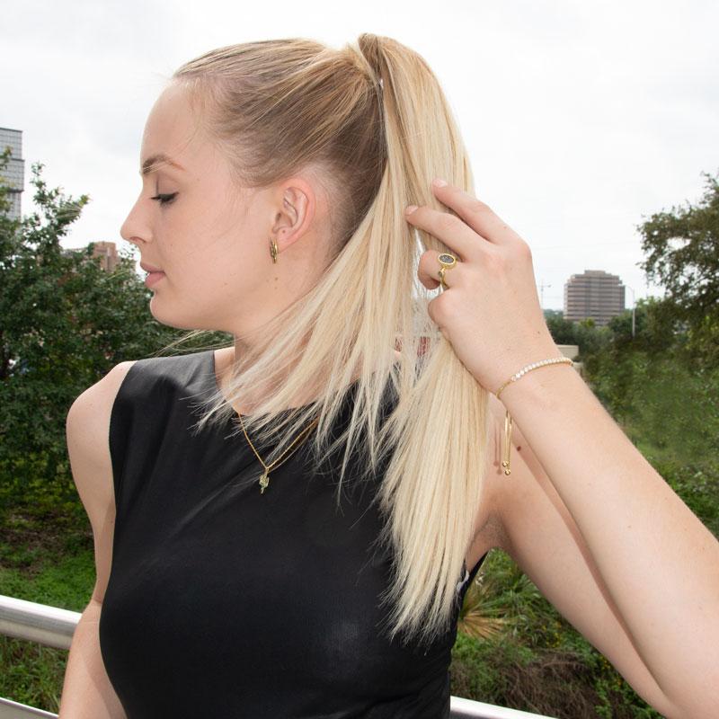 Ultramodern 14 karat gold plated sterling silver ring. At center sits a 6mm x 12mm druzy offset with a 3mm round druzy. Band measures 2.1mm. Available in whole sizes 6-9. .925 Sterling Silver